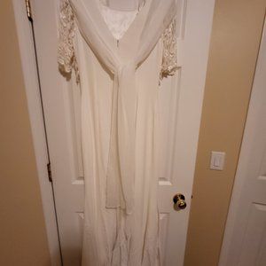 Beautify Jessica McClintock white full length size 6 dress with lace upper bodice and an attached shawl that drapes back from the shoulders. In perfect condition. Only worn once. Great for weddings or prom.