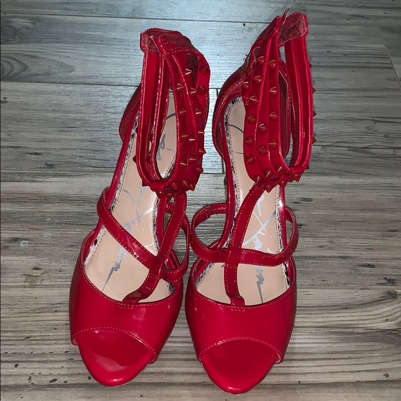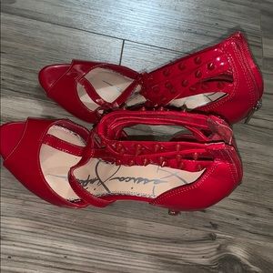 Studded heels in red. Has minor scratches in one heel but in good condition. Very comfy and cute. My shoe size is 7/7.5 and this one is quite big for me.
