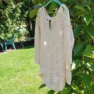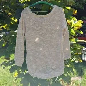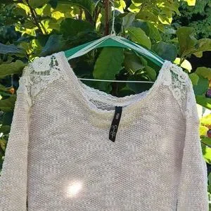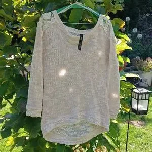 This light sweater has a beautiful style. It has a high low look with pretty floral shoulders. It is a nice way to stay warm, looking stylish and chic! It is XS.
