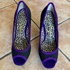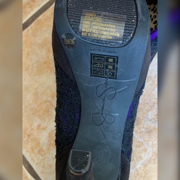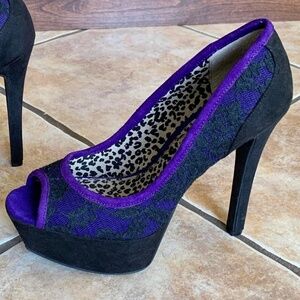 This beautiful style by Jessica Simpson features a central majestic purple upper with sexy lace overlay. A sleek black suede envelopes the platform & heel.