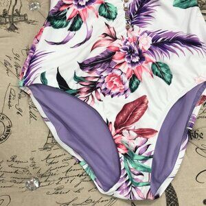 A lush island print lends resort-ready style to this one-piece from Jessica Simpsons, a sleek swimsuit with buttons and keyholes at the front.