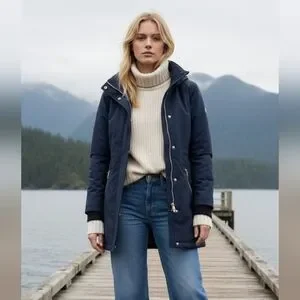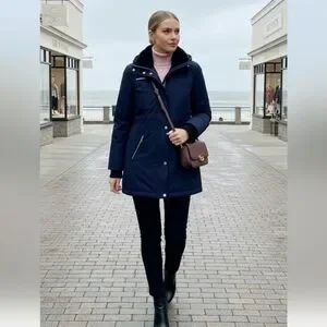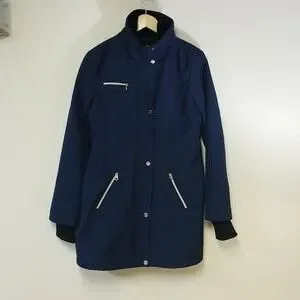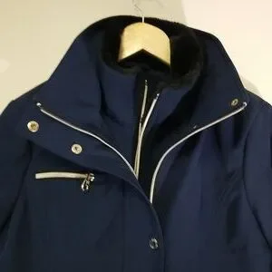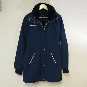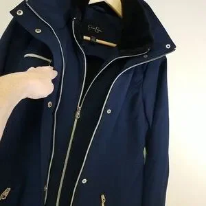 Perfect for fall through spring in milder climates, you stay stylish, dry and warm with this midweight sleek navy jacket. Perfect for any occasion. So many storm proof layers, faux fur cozy collar and inner zip up attached vest and fleece lining will keep out the chill.