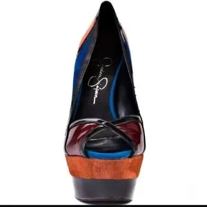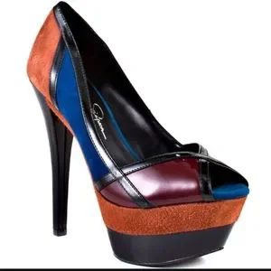 Jessica Simpson Fun/Sexy color block peep toe heels. Contrasting Suede & vinyl like leather. Bold enough to make a statement & surprisingly comfortable wear. EUC just a bit dusty, worn once, dee pics light wear mark