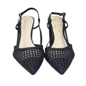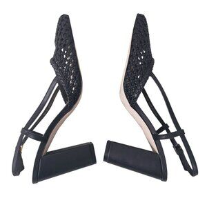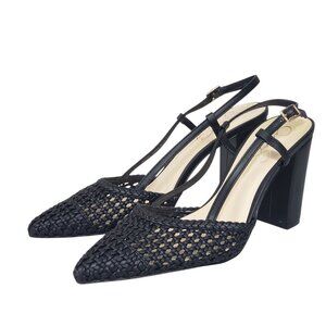 -FEATURES: Woven front details, pointed toe, sling back with metal closure, block heel, very sophisticated.
