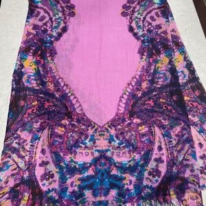 Stunning Travel Wrap by Jessica Simpson. You will think that it is a light cashmere, but it is a very very soft acrylic. Light and flowing, but just that little extra on your shoulders. 80x28.5" approx. Looks amazing as just an accent piece too. There is a small pull, in the pattern area so you may miss it. Please see the photos as the last two show this from each side. I have worn it and never noticed it until I examined it for listing. Final Sale.