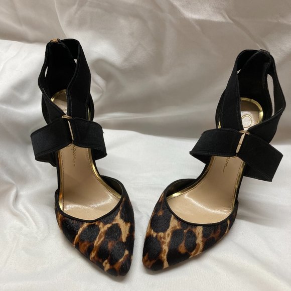 Jessica Simpson Leather Pointed Toe High Heel Animal Print Shoes Size 6 Black, Brown and Tan. These pretty shoes have a delicate square heel 4" high with elasticized straps and are made with leather cow hair. Minimal wear on these shoes.