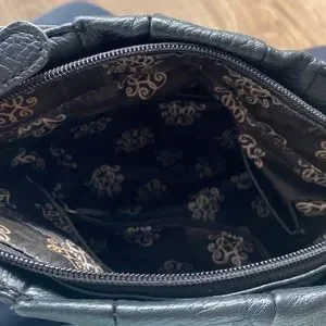 Medium size crossbody purse with adjustable strap and zipper closure.