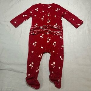 Adorable red baby onesie with white floral pattern. Features a ruffled front design.