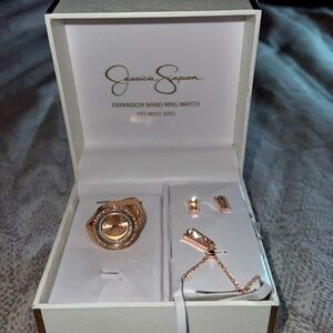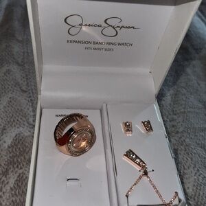 Jessica Simpson Rose Gold Crystal 3 Piece Set Ring Watch + Necklace & Earrings