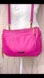 Vibrant fuchsia pink (rose red) colour bag with gold zipper/hardware, and gold feather jewel.