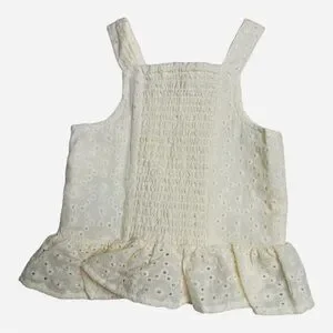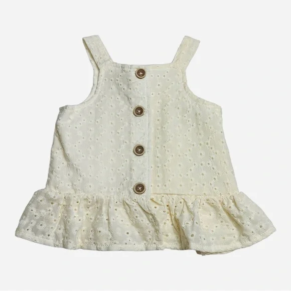 Classic button down ruffled eyelet tank top in a rich cream color.