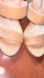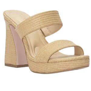 Stylish tan heels with woven texture. Open toe design. Comfortable block heel.