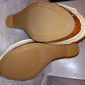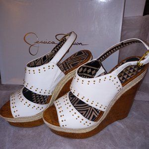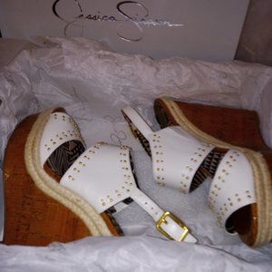 Wedge sandal, open toe, sling back, White letter upper, with gold beads, classy fabric pattern on sole