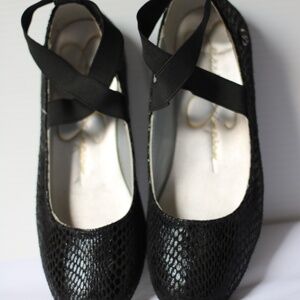 Pre-owned but like new condition (never worn). Jessica Simpson black faux snake ballet flats. Women's size 5 and all man made materials. Slip on style with elastic ankle straps and a lightly cushioned footbed. I bought these for my daughter but she grew out of them before she could wear them :(