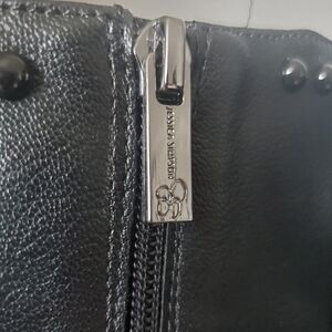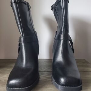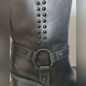 Never worn. Fashionable calf high moto boot. Faux leather with side zipper. 3 1/4 inch heel. Polished studs and harness straps.