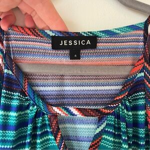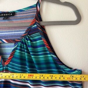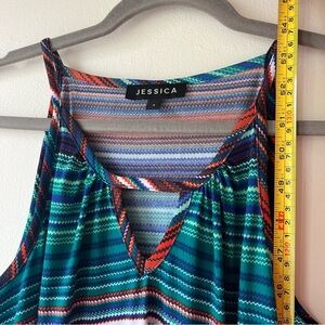 Vibrant and comfortable sleeveless maxi dress by Jessica in a multicolor horizontal stripe pattern. Features a flattering v-neckline and soft, stretchy knit fabric for all-day wear. Size 4. Made from 95% polyester and 5% spandex – perfect for warm-weather layering or vacation wear. Unlined.
