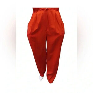 Tags still attached, featuring long sleeves and padded shoulders this garmet zips and buttons closed. The legs are straight and there are pleats at the waistline. Adorable red ribbon detailing at the shoulders. Made in Canada!