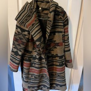 Wool coat. Size small but oversized fit. button closure with waist tie and has pockets!