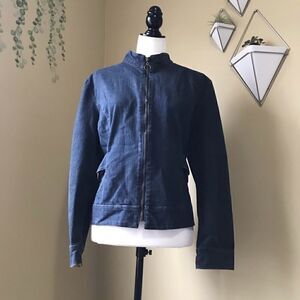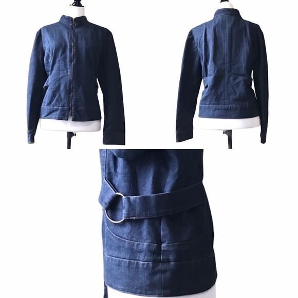 This fabulous denim jacket zips up, has straps on each side with metal hoop details. Has a great silhouette and slight stretch for additional comfort. Excellent used condition.