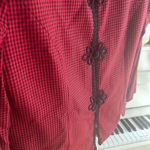 Elegant red and black houndstooth jacket. Features intricate trim. Ideal for a sophisticated style.