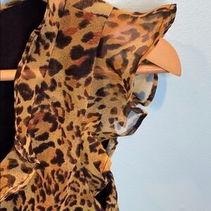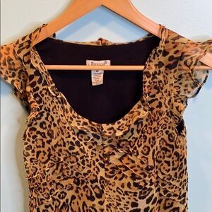 Jessica, Petite, Size 4, 100% polyester, under lined layer os black with the tiger patter at the bottom with the top layer being the tiger pattern. This dress looks really cute on and is comfortable. It no longer fits me so it’s time to let it go.