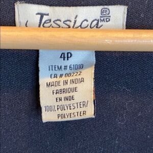 Jessica, Petite, Size 4, 100% polyester, under lined layer os black with the tiger patter at the bottom with the top layer being the tiger pattern. This dress looks really cute on and is comfortable. It no longer fits me so it’s time to let it go.
