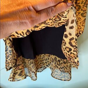 Jessica, Petite, Size 4, 100% polyester, under lined layer os black with the tiger patter at the bottom with the top layer being the tiger pattern. This dress looks really cute on and is comfortable. It no longer fits me so it’s time to let it go.