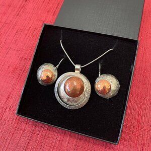 This striking handmade jewelry set combines sterling silver with warm copper accents, creating a harmonious blend of textures and tones. The necklace features an elegant pendant with interlocking circles, symbolizing unity and continuity, while the matching earrings mirror the sophisticated design. Perfect for adding a touch of modern artistry to any outfit, this set showcases timeless craftsmanship inspired by the beauty of simplicity.
