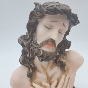 I have 2 resin statues/busts depicting Jesus in his Passion; they are vintage but unused and they are hand painted. Jesus' eyes are closed and his hands are folded, suggesting that it is of when he was taken down from the cross. They were made by Creations Bella, who provide statuary to St. Joseph's Oratory in Montreal and other religious institutions. They discontinued the statue years ago leaving it in the upstairs of their warehouse where I was lucky enough to scoop them up.