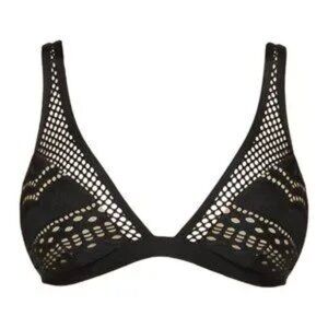 This Plunge Triangle Top in black lace is crafted from a stretch ribbed fabrication with eyelet lace and a contrast mesh trim. Tapered wide straps and soft moulded cups add comfort and support. Pair yours with the matching black lace pant.