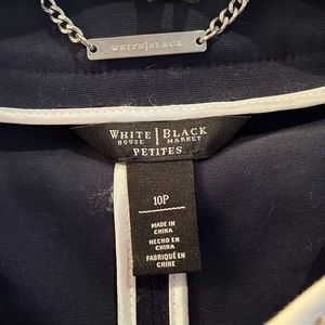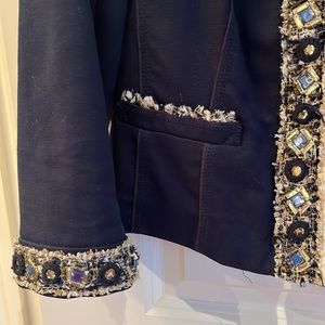 Navy blue jewelled jacket Tailored fit with clips in from to close. Can be worn as a top. Great condition beautiful jacket. Just too small for me.