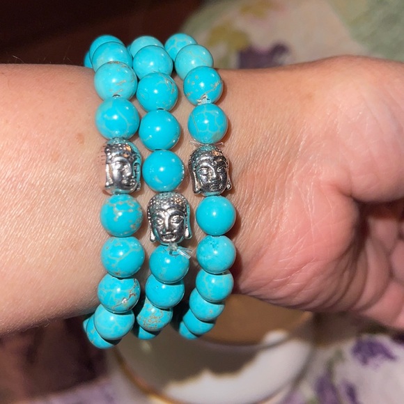 Set of three healing yoga turquoise stretchy bracelets. It also has three silver Buddha heads. Turquoise is known as the stone of calmness and tranquility. It can help in the removal of negative energies. Who doesn’t need a little help in their lives. Experience the magic of these gemstones….