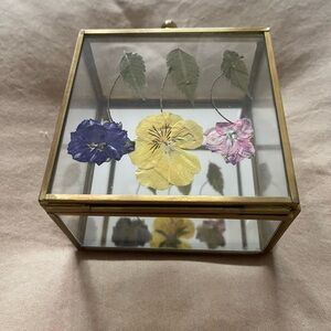 Elegant jewelry box with an antique gold metal frame, a built-in mirror at the bottom, and a beautiful square shape with a matching lid. Dry floral decor on the lid. Perfect for storing jewelry and small everyday items.