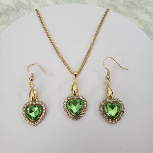 A pair of Heart Dangle Earrings and a Pendant Necklace accented with a halo of small, clear Rhinestones set in Gold Tone.