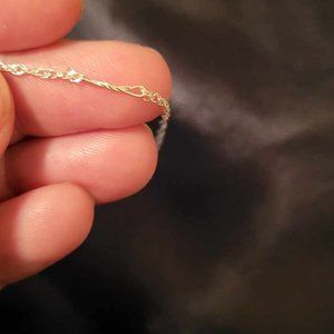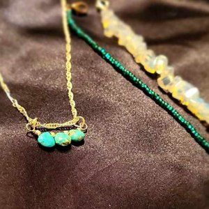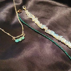 This listing includes what you see here, there are 2 pre-loved 6" braclets with clasps that I handcrafted, one with gorgeous green seed beads and the other with opalite chips. As well there is a 16" shiny metal twist chain, this chain was repurposed and the image shows that it has been repaired with a small amount of wire, which is hardly noticeable. On the chain though is a sterling silver genuine turquoise pendant that I handcrafted as well. These will all be shipped in the cute little Hermes envelope box.