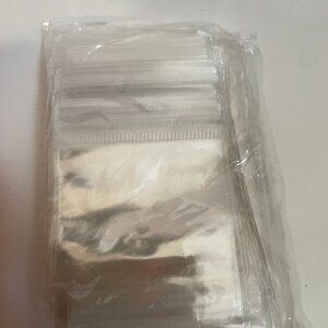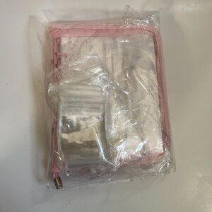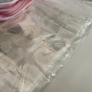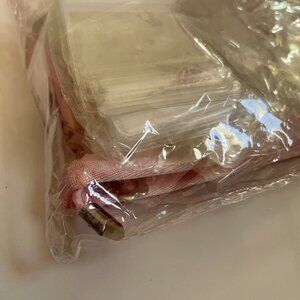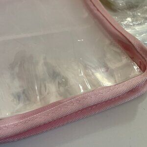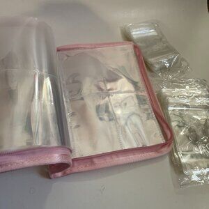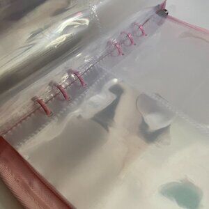 Portable earring and jewelry storage book with pink zipper cover and clear pages for easy viewing