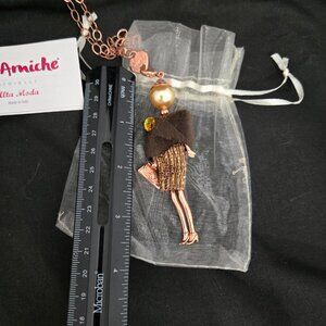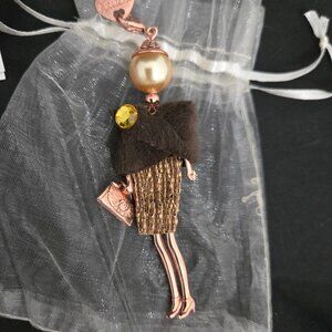 She is rose gold plated with white simulated pearl dressed in a posh brown outfit.