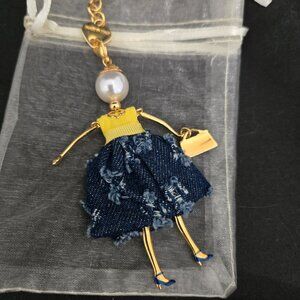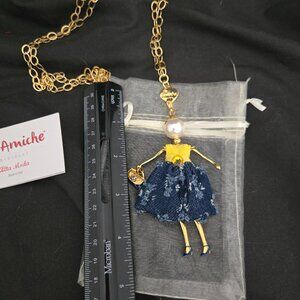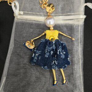 She is gold plated with white simulated pearl dressed in yellow and blue denim.