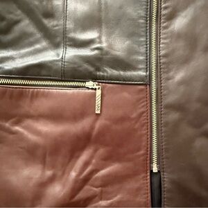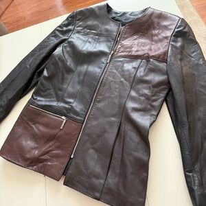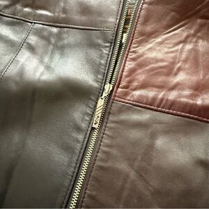 This jacket features quality patched leather in black and deep brown, with a full front zipper closure and two zippered front pockets.