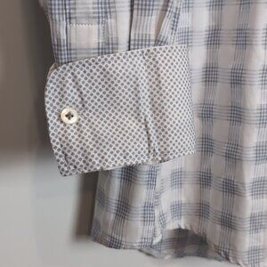 Elevate your wardrobe with this stylish white and gray checkered shirt. Perfect for any occasion, light colored shirt is made of breathable cotton. Features contrasting trim, with convertible cuffs for a versatile look.