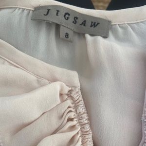 Blush pink women's Jigsaw blouse with front frill. Cap sleeves and clasped front closure. Worn once. In excellent condition. 100% silk.