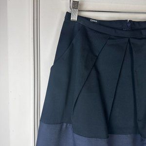 Released in 2016, this skirt from Jil Sander’s extension line, Jil Sander Navy, is made in a navy stretch cotton on top, and another white-striped cotton on the bottom. It features a skinny waistband, waist pleats, front slanted pockets, and an invisible zip back closure.