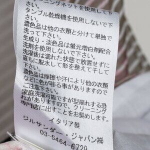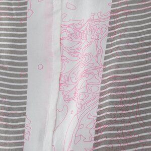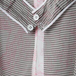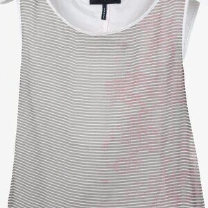 This almost illusory tank blouse from Jil Sander features a grey and white striped silk body with pink topography faintly layered on top. Underneath the silk body is a soft cotton inner, with the back of the blouse featuring a double button closure.