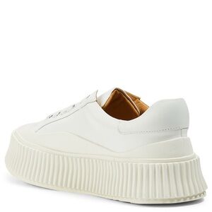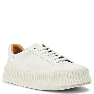 Jil Sander platform sneakers in smooth white leather with a sculptural ribbed sole and warm tan leather lining. Made in Spain with the clean construction and weighty feel Jil Sander is known for.