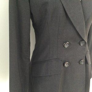This is a ladies business suit by Jil Sander: a classic dark grey double-breasted blazer and matching skirt in pure Gabardine wool and fully lined. European size 34 which is equivalent to US size 0P. Jacket length 27"; Shoulder width 15.5"; Jacket waist 29"; Sleeve length 22"; Skirt waist 26"; Skirt length 18.5". Perfect for important business meetings, dress down with a pair of casual pants or a chic top - the endless choices are all yours! Bought new for $1500+ in the beginning of my banking career and kept in like-new condition.