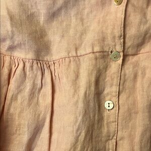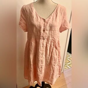 Jillian Harris x Priv pale pink linen baby doll dress. Short sleeves, pockets and pearlescent button details up the front. Fully lined.