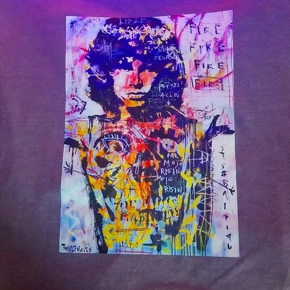 100 % coton .....it is a women large size V neck from Eddie Bauer...it is totaly awesome and yes it is a unique piece . there is no other like this one....