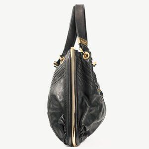 Made in Italy, this Alex bag from Jimmy Choo circa 2007 is crafted in a black leather, and features gold-tone hardware, double adjustable shoulder straps, stitched detailing, an outer frame for structure, and a decorative strap. The magnetic snap closure opens to a beige microfiber-lined interior containing two slip pockets, two side pockets, and a zip pocket.