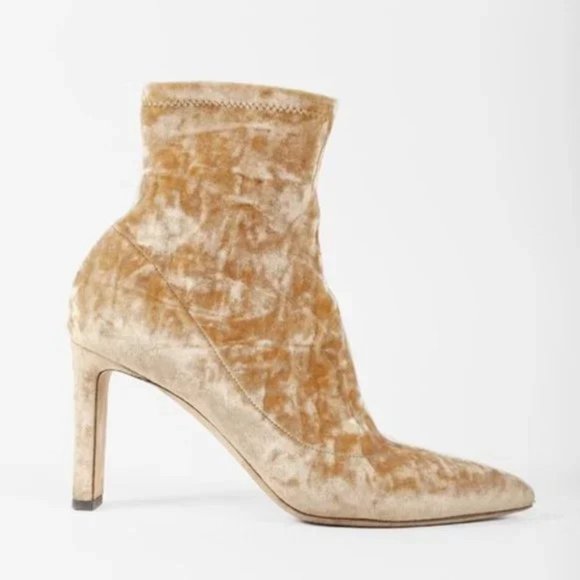 Louella sock booties from Jimmy Choo are crafted from soft crushed velvet in beige and feature a rectangular 90mm heel, tonal top stitching, a pointed toe, and leather insoles and outsoles.