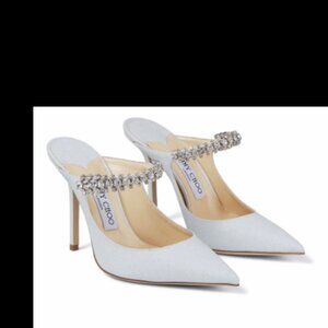 Jimmy Choo showcases the brand's glamorous style through crystal embellishment across the front of this pair of mules. Their pointed-toe silhouette and stiletto heel adds to this refined feel.